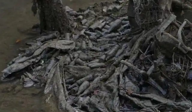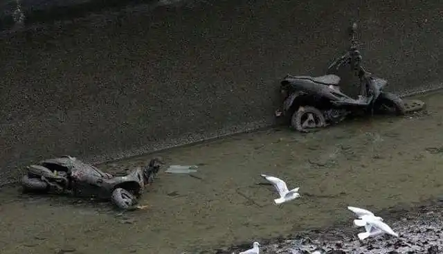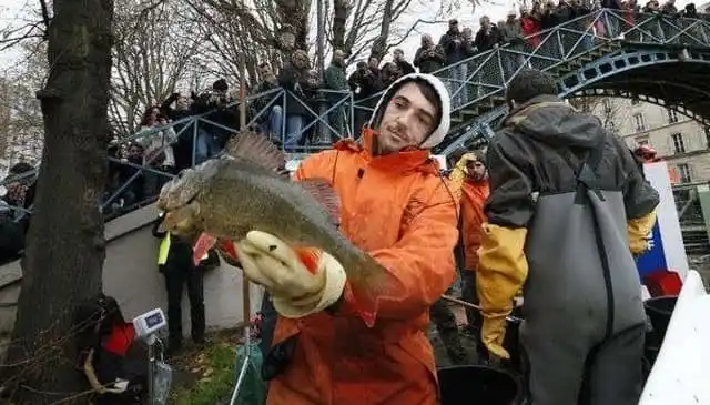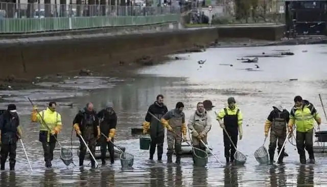 Vendredi 31 Octobre 2025 : A PARIS, vidage et nettoyage en grand du Canal Saint Martin. Photos : cette équipe récupère les poissons vivants pour les emmener dans une réserve. On trouve de tout dans le fond de ce canal. . .