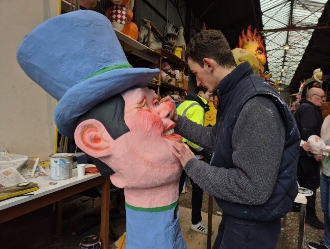 Dimanche 01 Février 2026 : Dimanche 22 Février 1er défilé du 105ème Carnaval Chalonnais. Les préparatifs s’accélèrent dans leur grand atelier . Ici, remise en état d’une grosse tête. .