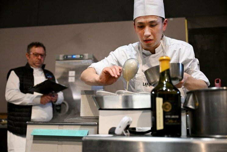 Mardi 31 Mars 2026 : Hier lundi 31 Mars, sept candidats ont participé au “Championnat du Monde du Poulet de Bresse à la Crème”. Le grand vainqueur est un Japonais, le Maconnais Pierre POINCET termine pour la seconde année à la 2ème place. Photo, le vainqueur en plein travail devant l’un des jurés. . .
