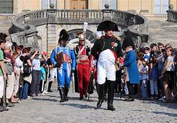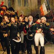 1814 : Napoléon fait ses adieux à la Garde : Dans l’escalier d’honneur du Château de Fontainebleau, le 20 avril 1814, l’ex empereur Napoléon 1er fait solennellement ses adieux à la Garde et baise son drapeau ! . . .